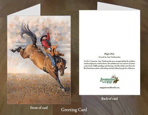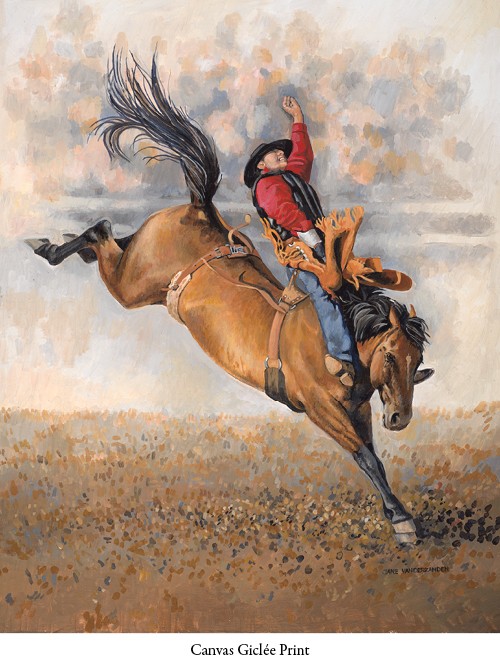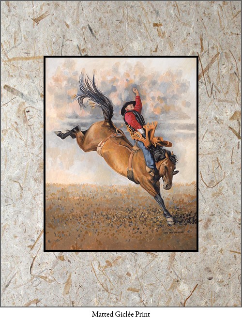 Bucking bronc horse acrylic painting. CANVAS PRINT: Giclee print is printed with archival inks on premium canvas. Artwork does not wrap around to the sides of the canvas prints. Size options are 16"w x 20"h x .75"d or 11"w x 14"h x .75"d — MATTED PRINT: Giclee print is printed with archival inks on premium paperstock. Size options are 16"w x 20"h or 11"w x 14"h — GREETING CARD: Blank inside and printed on heavy weight paperstock. Size, 5"w x 7"h (folded); 10"w x 7"h (flat), includes white envelope. — ORIGINAL 16"w x 20"h acrylic painting available.